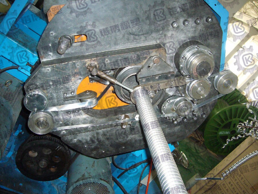 4.2.4?铠装主机成型系统在主轴出线端,由一台15KW变频电机带动一台法国进口设备行星齿轮差速变速器,通过同步带带动装在主轴上的行星齿轮及同步带系统,从而带动成形压轮旋转。放带盘将带材放出后经过导轮由主轴中心孔进入主轴出线端的铠装成型系统,通过成形压轮压成形,经过导带装置进入一个螺旋状的导向弯钩,主机每转一圈。成形的带材绕在电缆上实现一个节距,通过主机的旋转实现电缆的铠装。铝带成管铠装时的旋转升角:
