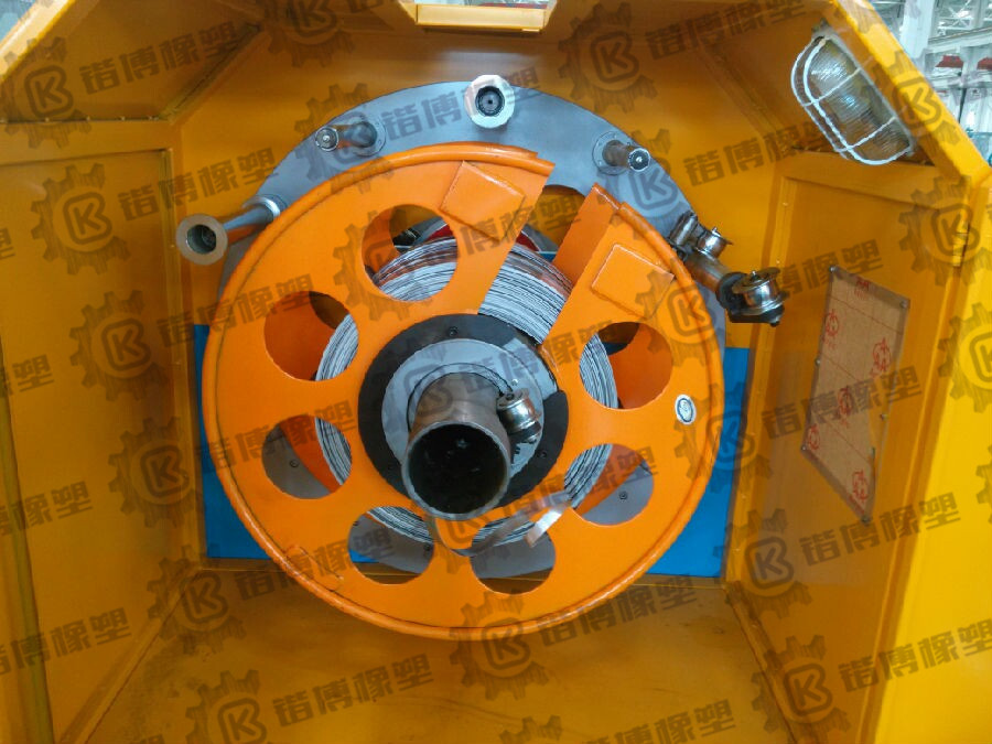 4.2.5?主机的中心装有两根不锈钢中心管一根与主轴连接在一起,起到输送铝带作用。另一根内中心管固定不转,为避免电缆线在铠装过程中擦伤,设备在进线端装有聚四氟材料的定位模块,用于保护和固定电缆线。